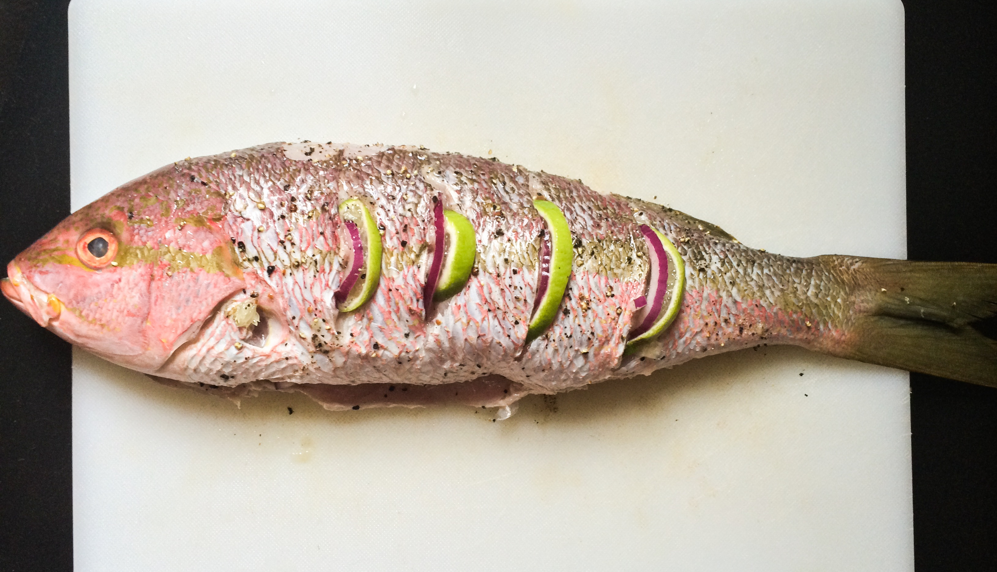 - Rinse fish, pat dry with paper towels. Cut 3-4 slits on each side. Sprinkle juice from 1/2 lime then S&P all over and inside the fish. Insert lime slices and red onion into slits and belly cavity. Marinate for 15 minutes.