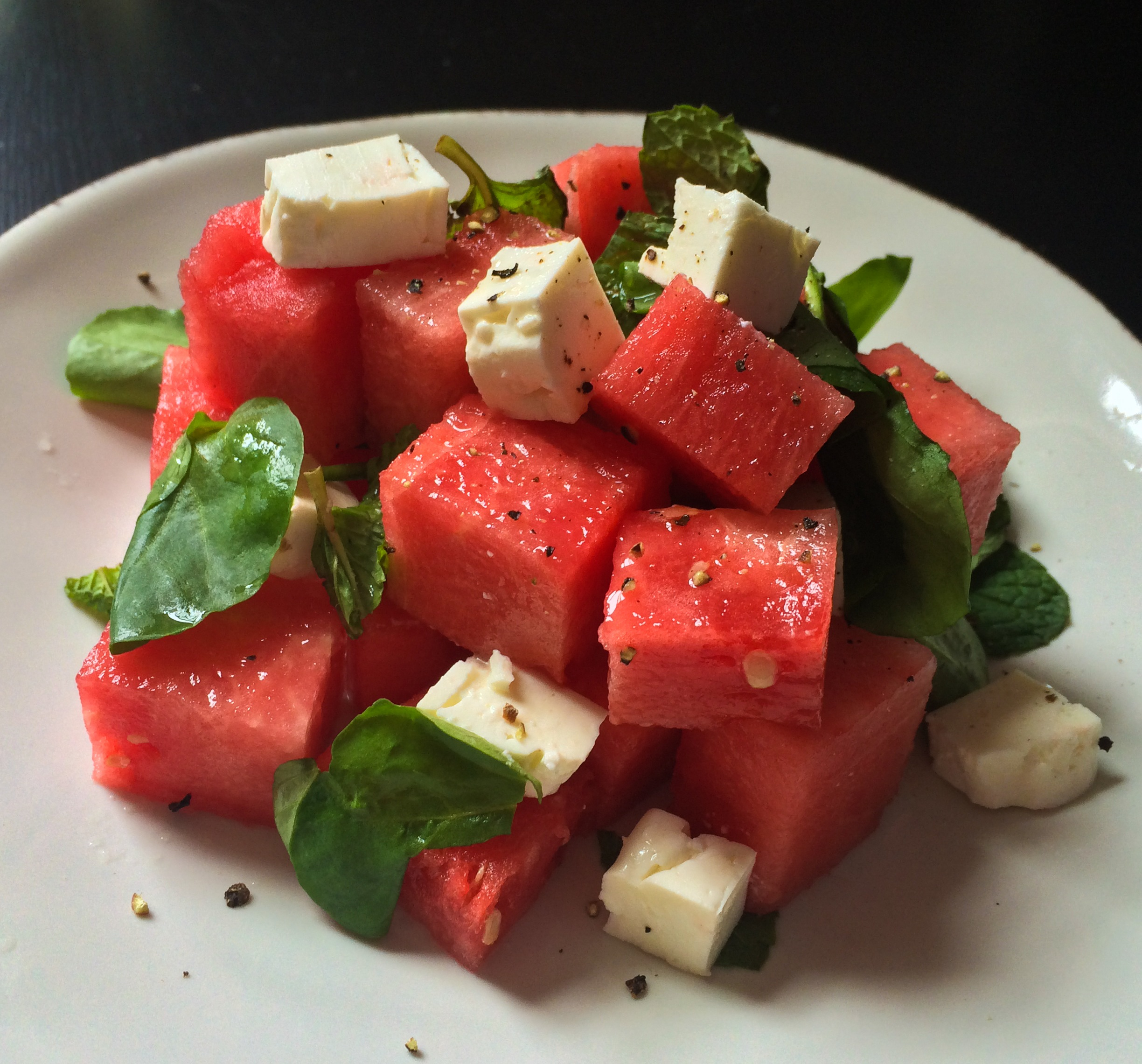 - While the snapper is marinating, cube watermelon and feta. Rinse and dry watercress and mint. Combine watermelon, feta, watercress and mint with lime juice and pepper.